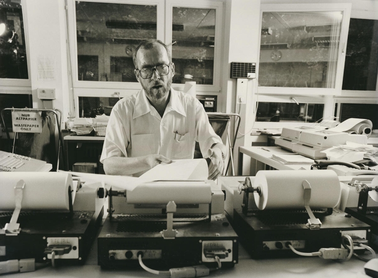 Workstation at the Central News Department at Radio Free Europe/Radio Liberty, Munich. Dispatches came in through telex machines, a technology fundamental for press agencies before fax became popular.