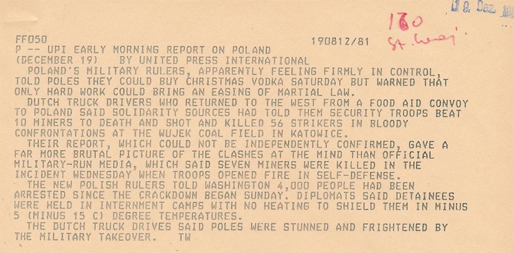 UPI report on December 18, 1981. While the Dutch truck driver in the report recalled 66 casualties, and UPI quotes the Polish state media to admit 7, the actual number of deaths in the Wujek massacre was 9.