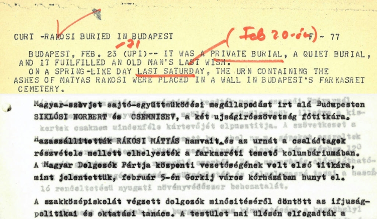 Naturally, Rákosi’s death in 1971 also caught their attention: separate Situation Reports summarized the available information on the circumstances of his death and his funeral. The latter claims that the funeral took place on February 23, and proudly stresses that while Radio Petőfi in Hungary reported the secret event only at 4:30 p.m., Western radios had covered it already at noon. However, a UPI news item cited unidentified sources claiming the actual date to have been February 20. They were mistaken. The Hungarian radio report truly was broadcast on February 23, yet the funeral had been carried out one week earlier, on February 16.