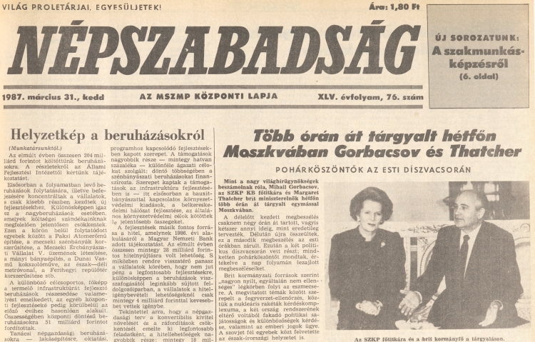 The 1987 Thatcher–Gorbachev meeting in Moscow on the front page of the Hungarian party daily Népszabadság (People's freedom) the next day.