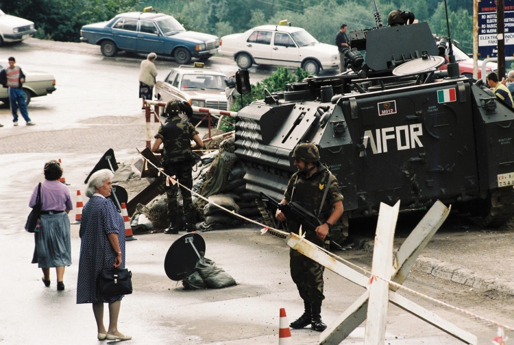 An elderly woman jokes with an Italian soldier as she walks by a NATO Implementation Force (IFOR) checkpoint