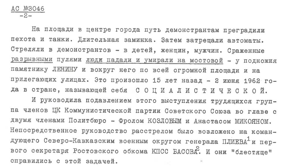 Following its publication in Paris, the Gulag Archipelago circulated in samizdat in the Soviet Union. Soviet dissidents got informed about the Novocherkassk events from Solzhenitsyn’s work. Signing an appeal in 1977, 15 years after the shooting, 22 Soviet dissidents (including Andrei Sakharov, Yelena Bonner, Tomas Venclova, Naum Meiman, and others) suggested to mark June 2 as a day commemorating the Novocherkassk events, as a memorial day of struggling against the bloody terror of the authorities. The appeal was published in two major bulletins, both of which were initiated by the Research Department of Radio Liberty: Sobranie Dokumentov Samizdata (Collection of samizdat documents) and Materialy Samizdata (Materials of samizdat). These bulletins reproduced samizdat documents to make them available to the broader public (as well as to the radios). The appeal presents an emotional account of the riot, and the brutalities and silencing by the authorities, calling the responsible executors by name. The signatories praised the “persistent and courageous work by Alexander Solzhenitsyn” of gathering and spreading information about the shooting, again, omitting the Western press reports and publications from the 1960s. They speculated about the exact number and names of the victims, and about their burial places. Thus, despite making the story of the massacre public (for the selected readers of samizdat), it still required further effort to reveal the details persistently kept as a state secret.