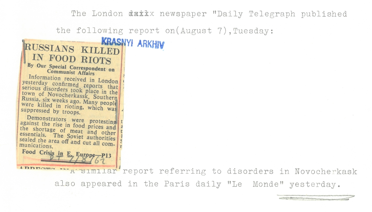 The report also noted that “by suppressing news of the disturbance in Novocherkassk and the Rostov area, Soviet media are suppressing the right of the people in the Soviet Union to be fully and accurately informed of developments in their own country.” Evident from the internal communication between its overseas offices, it was the information on the shooting that was the most sensitive, but the exact number of casualties remained unknown. In the subsequent months and years, lengthy articles followed in the West, interpreting the events in Novocherkassk (and in surrounding areas) as an indication that the continuing shortage caused by Khrushchev’s food policy might lead to new outbreaks of local violence.