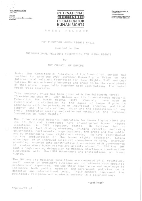 In 1989, the Committee of Ministers of the Council of Europe awarded The European Human Rights Prize to IHF together with Lech Wałesa, for having made “exceptional contribution to the cause of Human Rights in accordance with the principles of individual freedom, political liberty and the rule of law, which are the foundations of any truly democratic society and reflected notably in the European Convention on Human Rights.” Karl von Schwarzenberg, who accepted the prize on behalf of IHF, concluded his speech the following way: “I am here today only as the messenger of all those of whom I have spoken, and sometimes I fear that I resemble the one with the imperial message, about which my great compatriot Franz Kafka tells: ‘Nobody reaches through here, least of all with a message from one who is dead. You, however, sit at your window and dream of the message when evening comes.’”