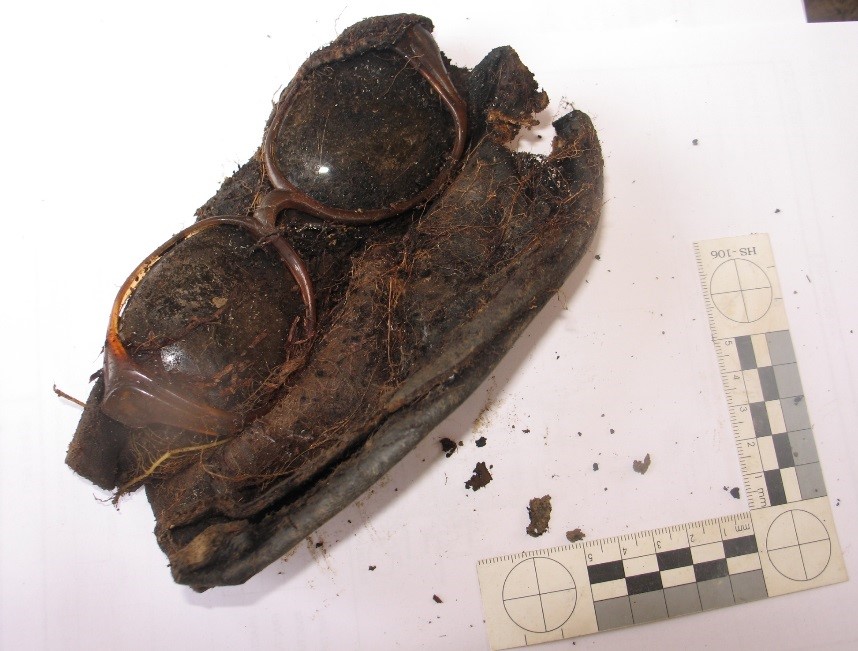 Prescription glasses of a Srebrenica victim found at the Ćanćari Road 9 secondary mass grave in 2007; the site was associated with the execution place at the Branjevo Military Farm.