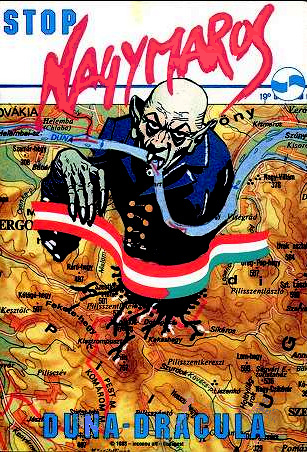 The Inconnu group also made the Danube-Dracula poster that just intensified the skull form. In this image, the teeth of Dracula are extracting natural resources from the Danube, while the merged Austrian and Hungarian flags are referring to the Austrian loan and constructor of the project.
