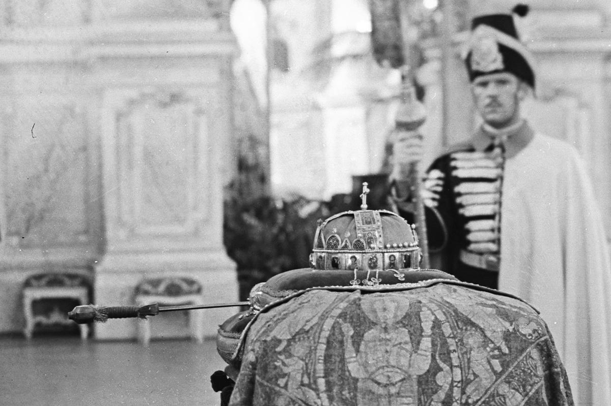 The Holy Crown and the coronation jewels on view in the Ballroom of the Royal Palace, 1938
