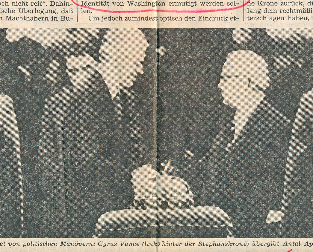 Seeking consolidation after 1956, Hungary reached a partial agreement with the Vatican in 1964, in an undisclosed part of which the Pope agreed not to appoint bishops to Hungary without the consent of the Hungarian state; thus the Catholic hierarchy was headed by “peace priests” collaborating with the authorities. As result of a 1971 agreement, Mindszenty left the US Embassy in Budapest for Rome as a sign of his obedience to the Pope. In the summer of 1977, Pope Paul VI received János Kádár and his wife—even presented her with a rosary—and was visited that same year by Walter Mondale, Carter’s vice-president. Presumably, the case of the Hungarian crown was discussed at both meetings. Carter, however, also had to convince a very skeptical American public, which included a considerable number of Eastern European émigrés who had arrived at the United States mostly after World War II and the 1956 Revolution. As part of a campaign serving this purpose, two archbishops of the American Catholic Church, Arthur Schneier, the Hungarian-speaking Chief Rabbi of New York who had been in hiding in Budapest during World War II, and the influential Baptist preacher Billy Graham, a close friend of Carter, were sent to Budapest. The Hungarian Baptist Church believes that it was thanks to Hungarian Baptist influence that the Baptist preacher convinced the Baptist US President of the importance of returning the Holy Crown.