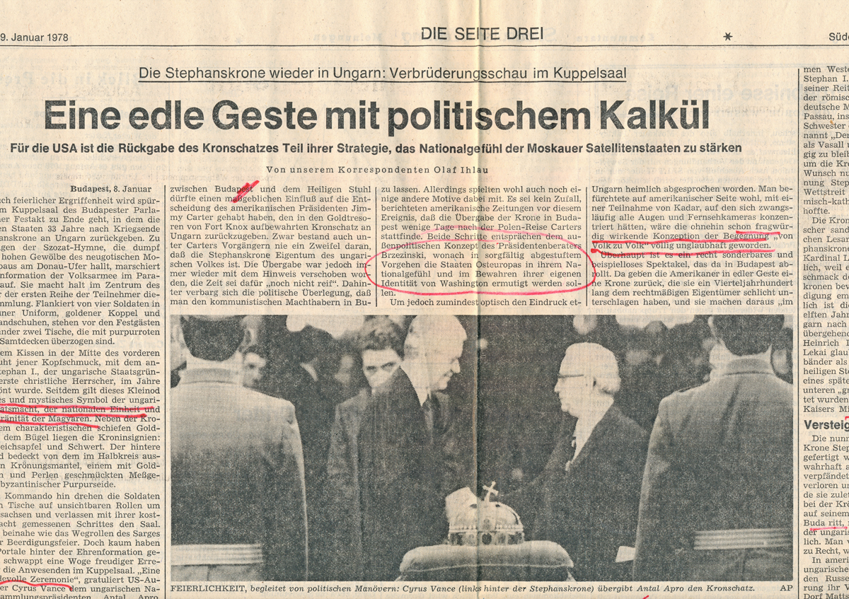In his report A Noble Gesture with Political Calculation, Süddeutsche Zeitung correspondent Olaf Ihlau suggested that “returning the crown is part of the US strategy to strengthen national feelings in Moscow’s satellite states.”