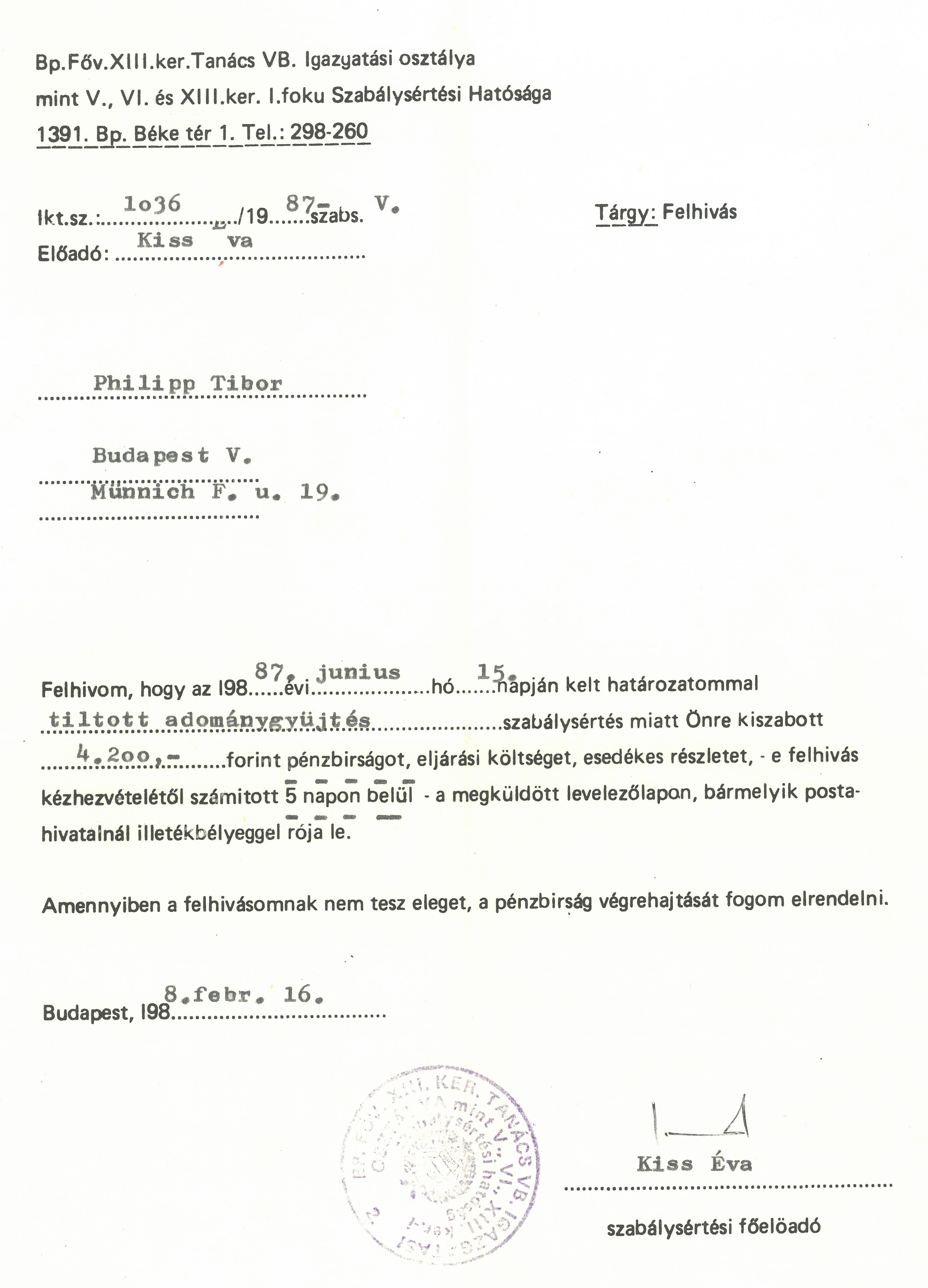 Program of a March 15 celebration organized in Tibor Philipp's apartment in 1987, and a penalty notice for forbidden fundraising.