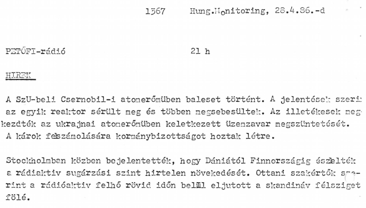 Hungarian Radio news item on Chernobyl on April 28 at 9 p.m., the first time the accident was reported in Hungary.