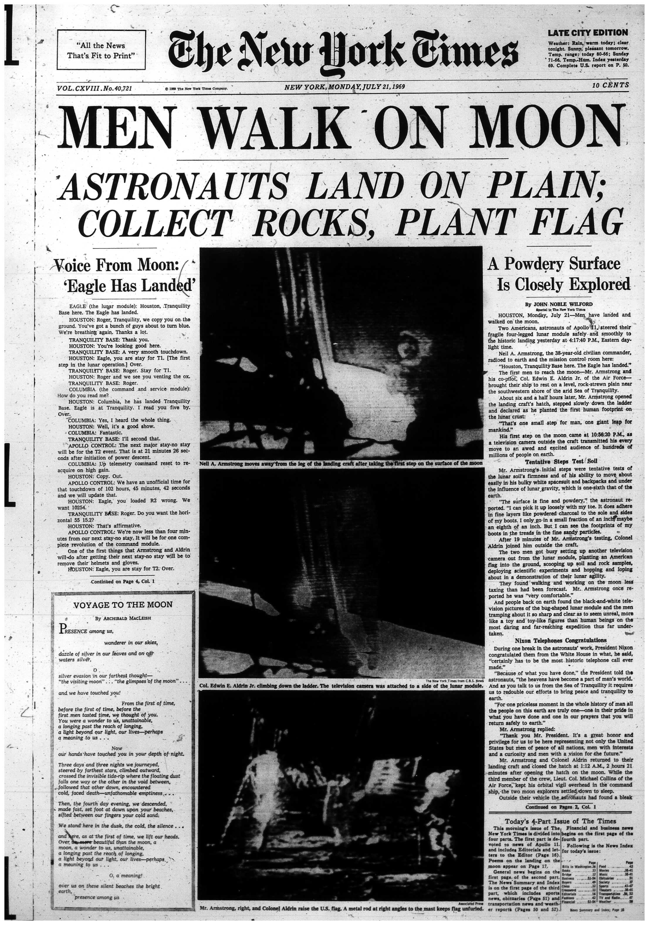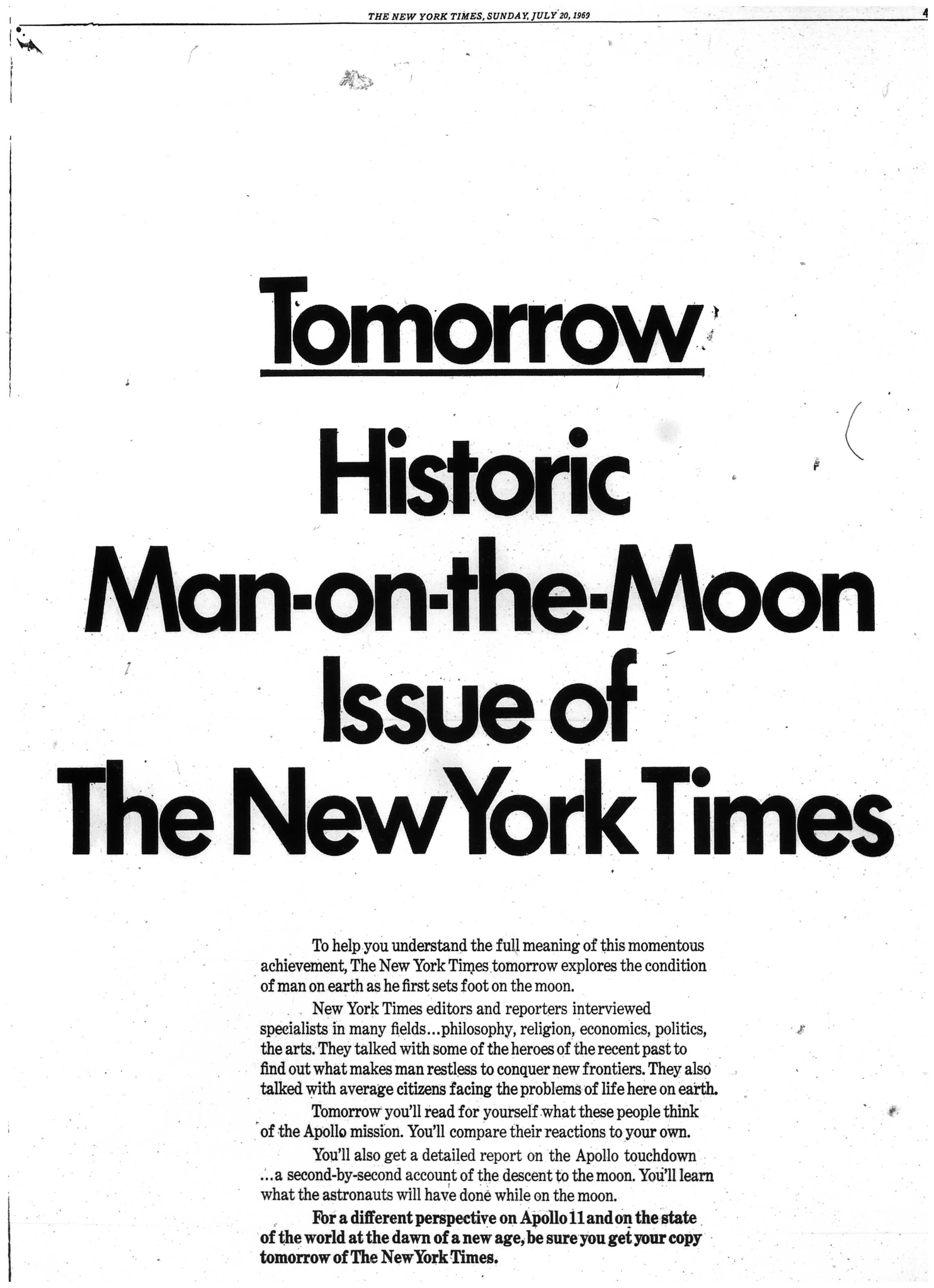 1. The New York Times of July 20, 1969 advertising next day’s special edition on the Apollo-11 mission, and the front page of the July 21 copy.