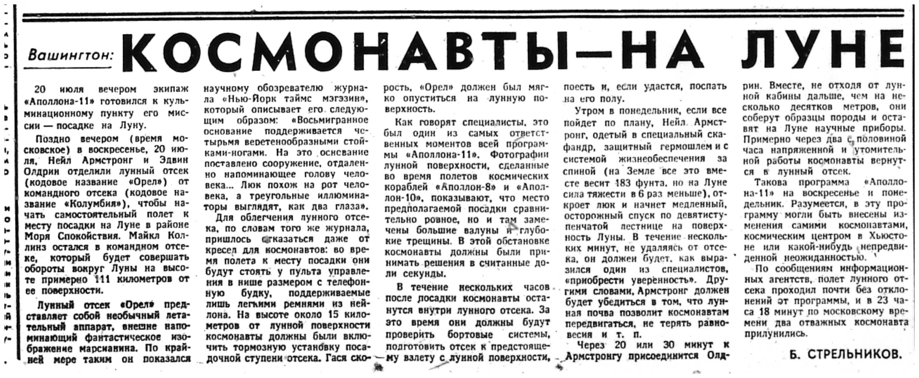 2. The lower part of Pravda first page on July 20, with a short paragraph, surrounded by six other small international news, entitled “Prilunilis” i.e. “Landed on the Moon”, continued on page 5.