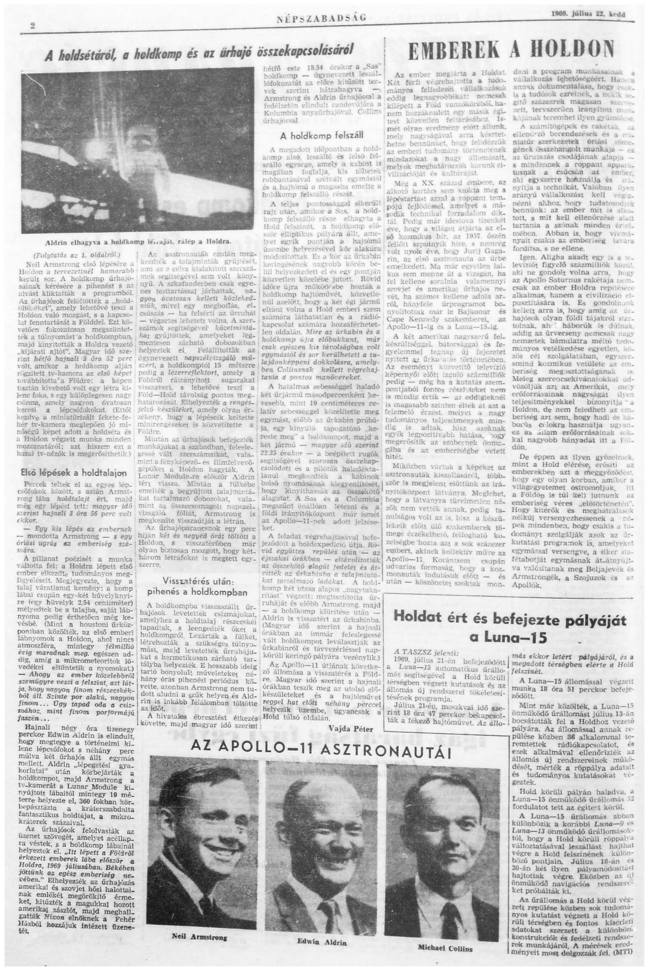3. The two-page report in Népszabadság on July 22. While the print press was one day late because in those times they did not appear on Mondays, listeners of Radio Kossuth were informed in the earliest morning news on Monday, July 21 that “People have been walking the Moon for one and a half hours!”