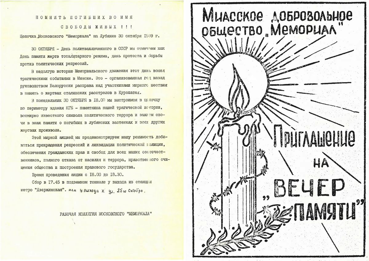 Leaflets advertising Memorial’s human chain around Lubyanka (l) and Evening of Remembrance (r).