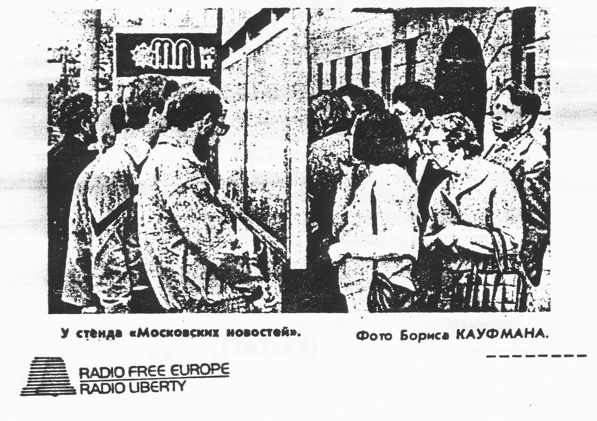 Photocopy of an article published in Moskovskiye Novosti, with photo depicting people queuing by the newspaper’s street stand.