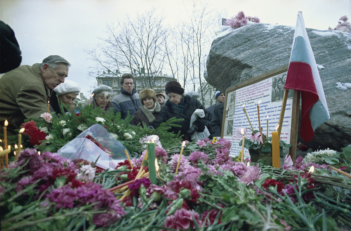 On October 30, 1989, Memorial organized a rally near Lubyanka, the headquarters and prison of the KGB in central Moscow. About 3,000 people with candles in their hands formed a human chain around the building to honor the millions of victims. A year later the same day and at the same place, Memorial erected the Solovetsky Monument or Solovetsky Stone, the first and most-known monument to the totalitarian regime’s victims: a granite boulder brought from the Solovetsky prison camp and dedicated to all victims of the political repression. October 30, now officially the Day of Remembrance of the Victims of Political Repressions, was not chosen randomly. In 1974, political prisoners from the Mordovia and Perm camps went on a hunger strike on October 30, to protest against political repression. On the same day, dissident human rights activist and author of the Chronicle of Current Events, Sergey Kovalev, held a press conference in Andrei Sakharov’s apartment, reporting this action; and was soon arrested.
