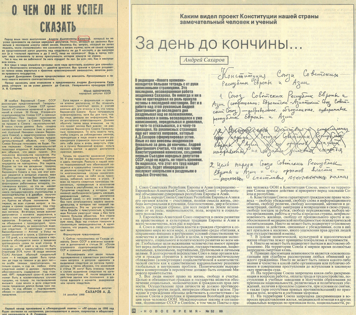 Sakharov's speech planned for the December 15 session of Congress, published in Literaturnaya Gazeta (l), and his draft constitution (with handwritten notes), published in Novoye Vremya (r).