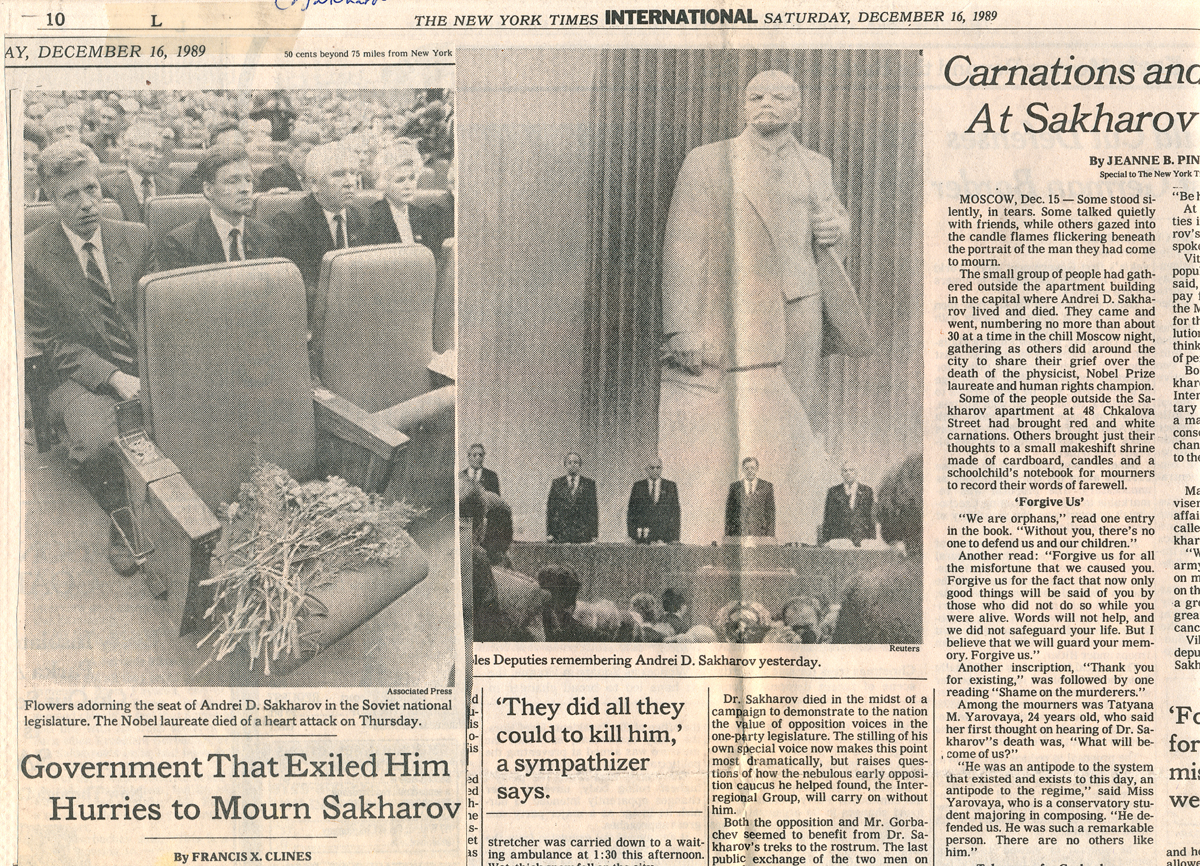 The New York Times report on the Congress of People’s Deputies of the Soviet Union commemorating Sakharov, with his empty chair (l) and, among others, Gorbachev (r).