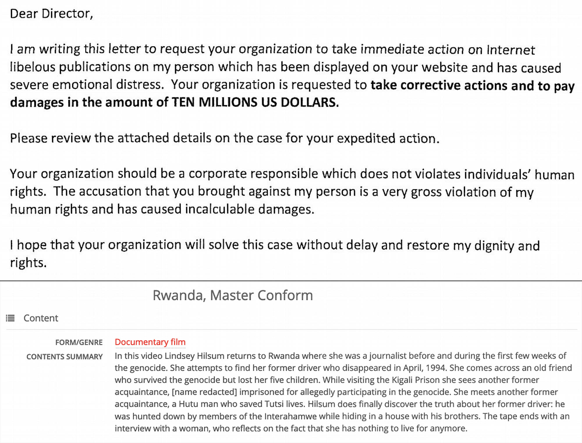 A few years ago, the Archives made the description of a BBC documentary on the Rwandan genocide available online. An imprisoned interviewee in the film says she was arrested for alleged war crimes. Soon, the Archives received a letter from the interviewee—living by then in the US—, demanding a compensation of ten million dollars for the harm (the risk of expulsion from the States) the online archival description caused to her. Although the film, including the interview, remains accessible to anyone, we decided to remove her name from the content summary.