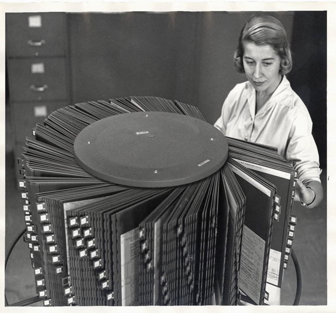 For a radio station employing migrants and situated kilometers away from the Communist bloc (in Munich), technologies and devices were there to reduce noise and human error, but in what sense? A laboratory type of work (rather than simply a journalistic one) is revealed by the photos. Chemical metaphors suggest a process of distillation: large amounts of data are transformed into information through strictly controlled operational phases of production. One caption says that “1,500,000 words are boiled down to a running file of just 100,000 words” that moves around the units. Radio Free Europe could thus be viewed as part of a larger set of activities, partly scientific in nature, designed to make sense of the inaccessible Soviet bloc. This ideal type of Cold War rationality has been elaborated by Lorraine Daston, Paul Erickson and their collaborators in their 2013 book, How Reason almost Lost Its Mind. The Strange Career of Cold War Rationality. It basically comprises formalization and transversal generalizations, across contexts and issues. Some of its tenets can be traced visually in the RFE photos as well: the reduction of problems to typified events, a transversal way of dealing with topics across languages and cultures, a propensity for cramming issues into pre-designed thematic inventories, standardized working postures and attitudes. As in the case of their more mathematical counterparts employed by RAND, techniques were considered to be independent of the problems to which they would be applied and valid for whichever technician would work with them.