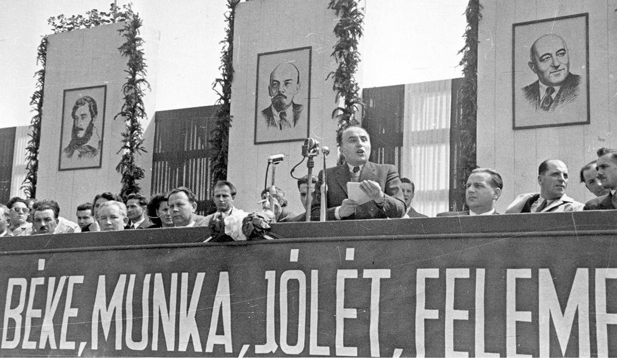 András Hegedüs giving a speech from a tribune decorated with portraits of Lajos Kossuth, Lenin, and Mátyás Rákosi, 1953