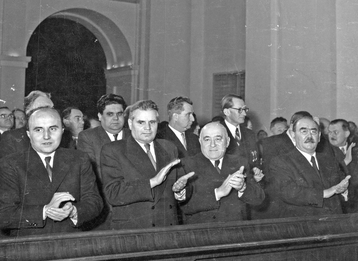 Hegedüs (l), Rákosi, and Imre Nagy (r) at a ceremonial assembly, 1954