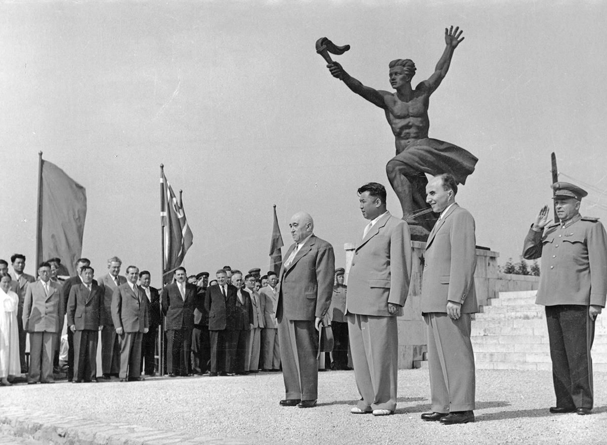 Kim Il-sung, Great Leader of North Korea, welcomed by Rákosi and Hegedüs, 1956