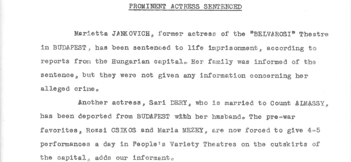 There is no mention of a Marietta Jankovich in the history of theater. Presumably, the Marietta Jankovich in this Information Item is actually Magda Jankovich. Such mistakes are relatively common in RFE reports, which may be explained by their origin; RFE acquired most of its intel from Hungarian refugees escaping to the West. Magda Jankovich later managed to defect, taking the path of an émigré, like Karády. In general, celebrity actresses of the Horthy era were sidelined, in accordance with the logic of Sovietization. Therefore, the report reinforces our take on the period today; it is factual, even if with minor inaccuracies.