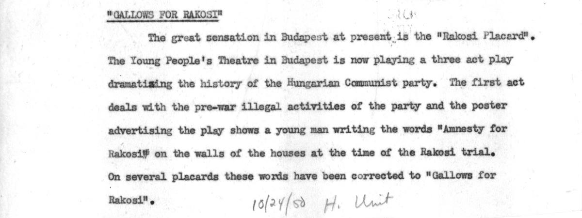 Information Item on anti-Rákosi inscriptions, from the Cold War Theater Collection.