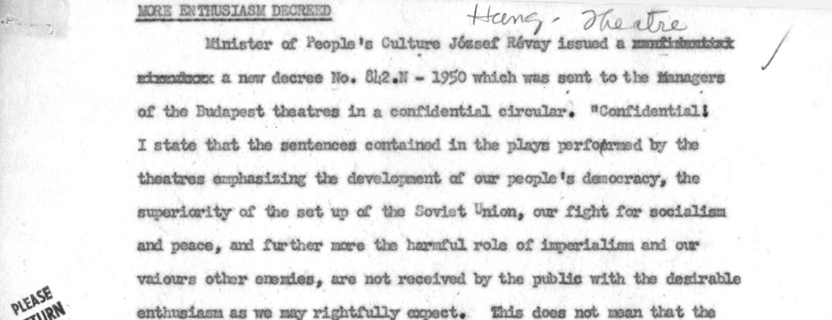 Information Item on Minister of Culture József Révai's secret decree, from the Cold War Theater Collection.
