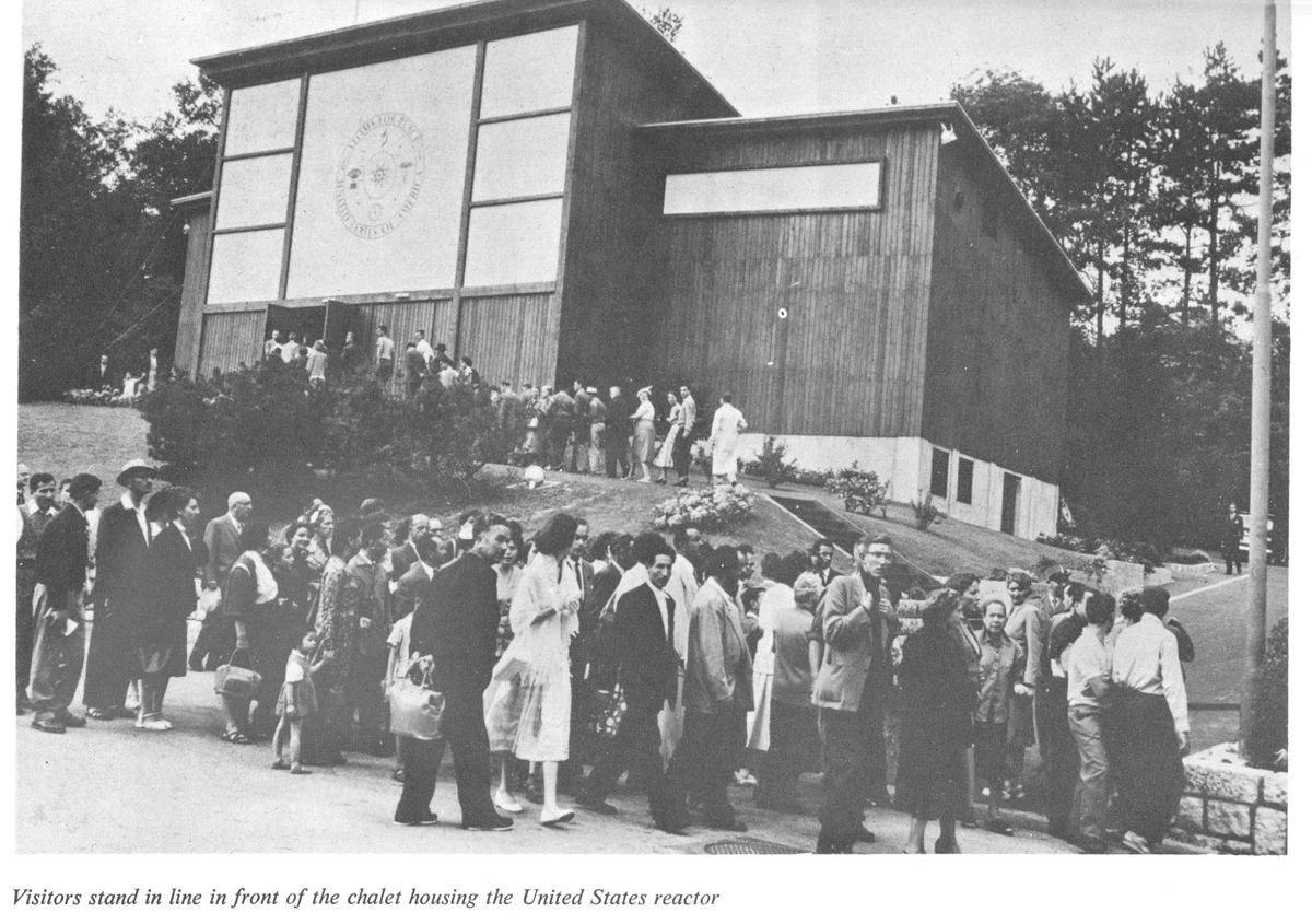 Photo from Laura Fermi’s Atoms for the World, featuring the Atoms for Peace logo.