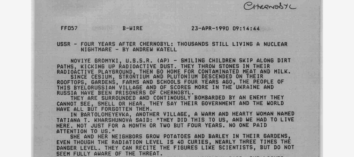The accident at the Chernobyl nuclear power plant on April 26, 1986, is at the center of the collection from the 1980s. The Subject Files compiled at the Samizdat Archives, a separate unit at the RFE/RL RI, examine multiple consequences of the catastrophe, including political, societal, and environmental aspects. In 1986, new cemeteries were raised for Chernobyl victims all over the region. International experts described Chernobyl victims exposed to high doses of radiation as “living dead,” while villages neighboring the site were evacuated. The accident had a strong impact on the long-term development of Soviet nuclear energy. It also heightened the importance of international organizations, such as the International Atomic Energy Agency, which implemented new policies in the aftermath of Chernobyl; yet, the station itself continued working. Journalists called the manifold fallout “the long shadow” of Chernobyl, ranging from leukemia outbreak in the region to victims going on hunger strikes for social benefits. Despite horizontal self-organization and the establishment of an All-Union Chernobyl Society, thousands were still living a “nuclear nightmare” years after the accident.