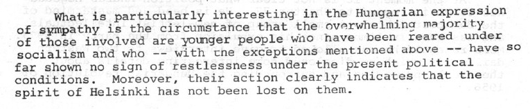 In 1976, the year after the Helsinki Accords was signed, the Moscow Helsinki Group was formed in the USSR, soon followed by similar groups throughout the country. The Workers' Defence Committee was established in Poland, and signatures were collected in Czechoslovakia reinforcing a political text. In January 1977, the text entitled Charter 77 was published in Western journals and read out on Radio Free Europe, as a result of which an authentic copy is preserved at Blinken OSA. Signed by 243 individuals, Charter 77 protested the violations of the very human rights recorded in the Final Act. The organizers were detained and imprisoned, which sparked Hungarian intellectuals to take a stand by issuing a two-sentence long statement of solidarity saying, "We declare our solidarity with the signers of Charter 77 and we condemn the repressive measures used against them. We are convinced that the defense of human and civil rights is a common concern of all Eastern Europe." In secret, 34 signatures were collected in support of the statement then sent out to the journal Le Monde. The RFE Situation Report on the case is accessible in the Archive's Digital Repository: