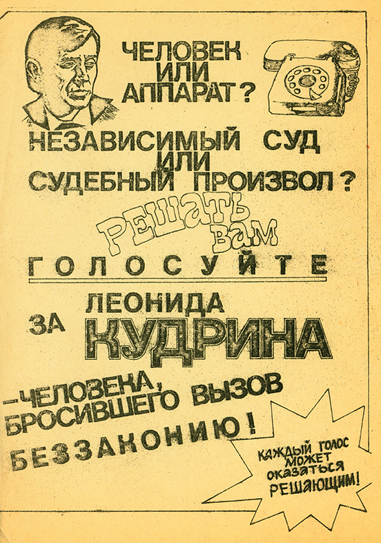 Candidates targeted the areas of their professional activity, and their experience of dissent or being sanctioned by the authorities became an asset in the election race. For instance, in the 1980s, the candidate Leonid Kudrin was a people’s judge in Sverdlovsk (present-day Yekaterinburg). Kudrin refused to consider administrative cases against participants of political demonstrations and rallies. For this, he was suspended from work, left the CPSU, and later joined the party Democratic Union. Campaigning in the 1989 elections, the former judge emphasized the flaws in the USSR judicial system and the tight interconnection of the latter with the apparatus. Kudrin was elected as People’s Deputy in the Sverdlovsk national-territorial district no. 25.