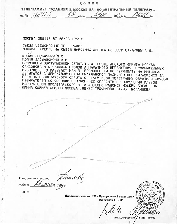 Democratic forces also claimed to register multiple cases of violation of electoral procedures. There followed complaints and hearings. Evidence of these violations is preserved, among other documents on the event, at the Blinken OSA. Two telegrams, for example, were addressed directly to Mikhail Gorbachev. The first telegram, authored by Irina Bogdanova and Sergei Kornev, reported that “apparatus candidates” denied them the opportunity to support deputies with a democratic civic position at rallies that extended beyond the Proletarsky District, thus preventing any activities in the neighboring districts and territories. The other telegram opposed a number of court proceedings against members of the human rights society Memorial. The latter were accused of petty hooliganism for their behavior while being people’s observers at the polling stations in Moscow’s Proletarsky District. The telegram claimed that the accused were, in fact, acting to prevent massive falsification of voting results.