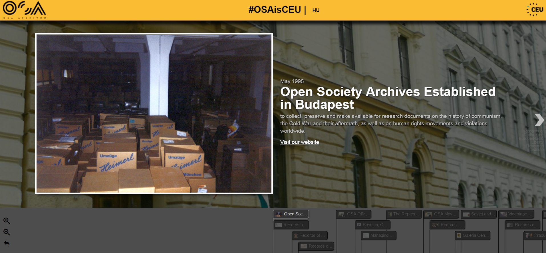 Over more than two decades of its existence the Vera and Donald Blinken Open Society Archives has grown to be not only one of the largest international archives of Communism and the Cold War but also an internationally recognized research center and an important player in the cultural life of Budapest. Not everybody is aware, perhaps, that the Blinken OSA is a professionally independent organizational unit of the Central European University, and has made a substantial contribution to the development of the local and international prestige of the University. This timeline recalls the milestones of the activity of the Archives, including events, archival collections, academic endeavors, conferences, exhibits and public programs, highlighting its organic relationship with the Central European University and Budapest.