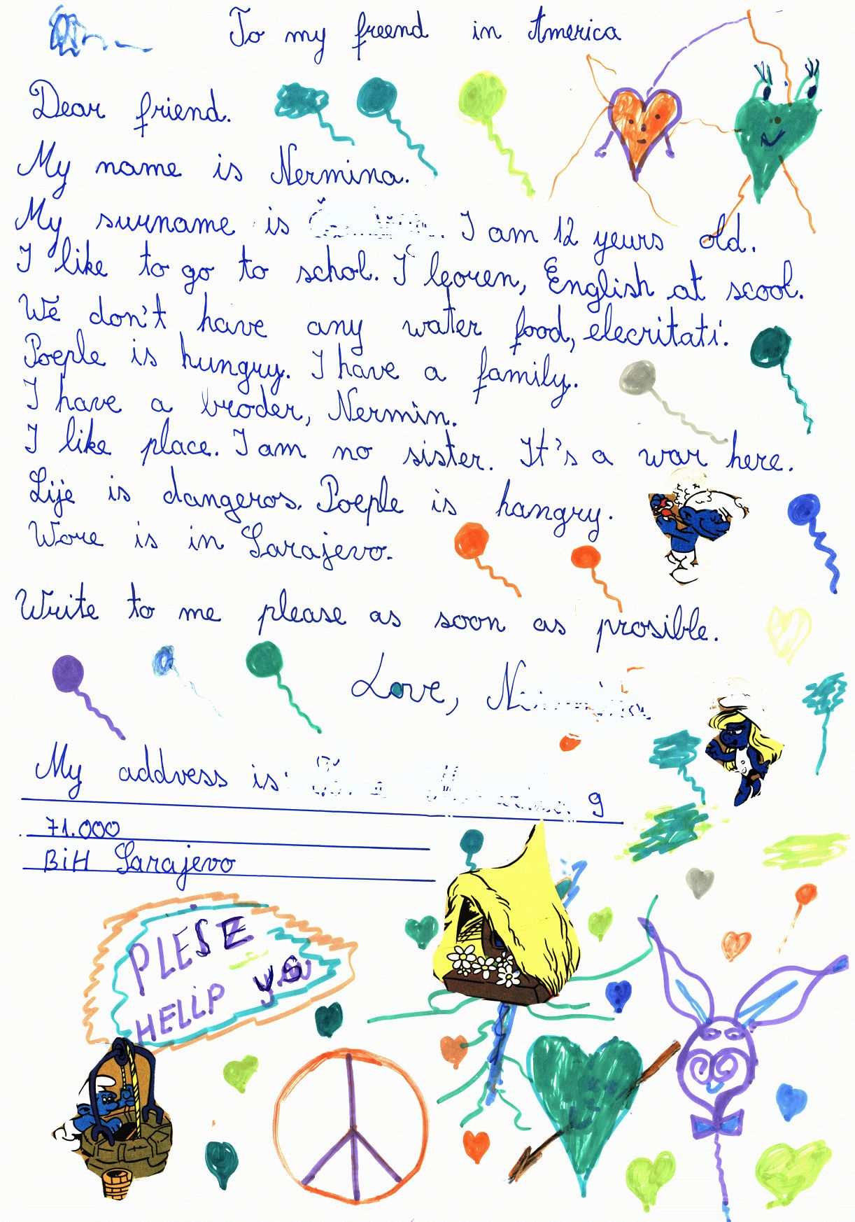 Blinken OSA has a collection of English language letters written by children from Sarajevo in 1993, to their peers (“Dear unknown friend”) in the United States as part of the Pen Pals for Peace Program initiated by George Soros. By the end of August 1993, some 400 letters from the besieged city, many with photographs, elaborated drawings and ornamented envelopes made their way across the Atlantic. In May 1994, the Open Society Fund published a selection of these letters in a tiny volume. Unfortunately, we don’t have any information about the further fate of the children. There are also a few letters sent by American schoolchildren, inspired by their Sarajevan mates, to President Clinton, urging him to stop the war.